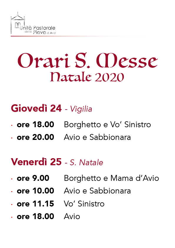 Visti l’ordinanza del Presidente della Provincia Autonoma di Trento e il DPCM del 18/12/2020 in materia di misure per il contenimento del contagio da Coronavirus e diversamente da quanto riportato sul bollettino settimanale, comunichiamo gli orari delle S. Messe di Natale nell’Unità Pastorale della Pieve di Avio.