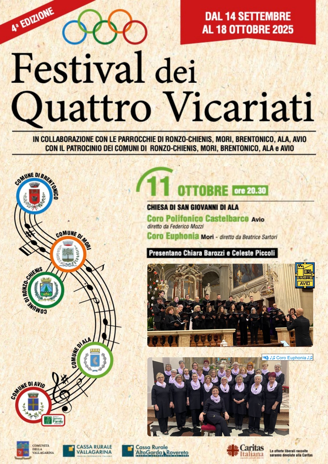 Sabato 11 ottobre 2025 in chiesa San Giovanni ad Ala si terrà un concerto inerente al festival dei quattro Vicariati, giunto alla quarta edizione.
